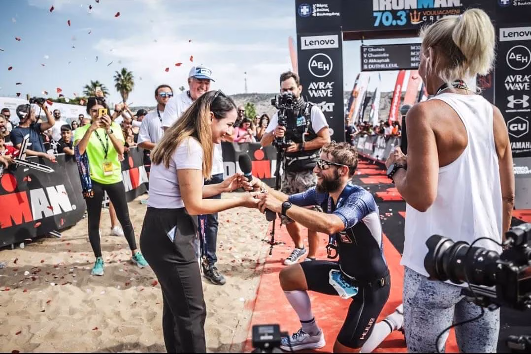 To kick things off right, at the finish line of his first triathlon – a half Ironman, no less – Vasilis got down on one knee and proposed to his now-wife. He had organized the whole thing meticulously, getting her involved as a medal presenter so she’d be at the finish area. He even has a photo of the moment: exhausted, sunburned, kneeling with the ring box in hand. With this as a start, the hook was set.
